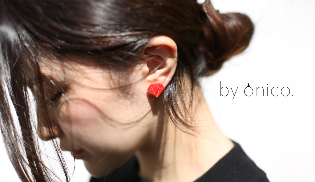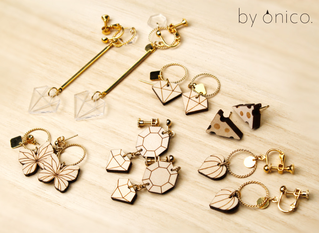 By onico. では、木材やアクリルを抽象的・象徴的なフォルムにカットしたオリジナルパーツを使用したアクセサリーを制作しています。